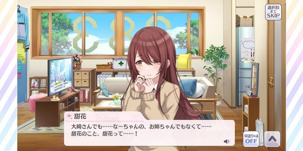 甜花は今のままで良く、その上で受け入れてもらいやすくなるための最低限の加工を施すというのが甘奈の考えだ。この加工は冬優子のように常に纏うものというより、愛依のように、必要な時だけ施されるもので構わない…そのように、甘奈は考えたことだろう。